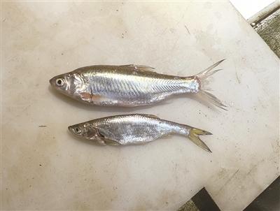 上周五早上九点多,记者来到余杭农贸市场,在水产区域找到了卖逆鱼的摊位,两盆银光闪闪的小鱼,大一点的卖18元一斤,小一点的15元。这比记者了解到的前几天最高35元一斤的价格便宜了不少。